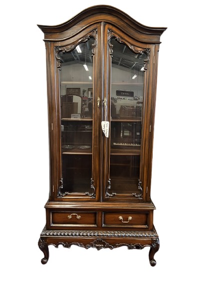 Add a touch of formal elegance to your home with this stunning solid mahogany display cabinet. Featuring a classic Queen Anne influence, this piece stands on impressive cabriole legs with hand-carved...