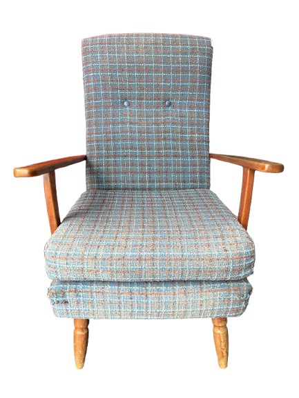 This is a classic 1960s/70s mid-century modern (MCM) high-back fireside chair. It features a distinctive blue and brown check/tweed upholstery. It has exposed wooden arms (likely beech or mahogany...